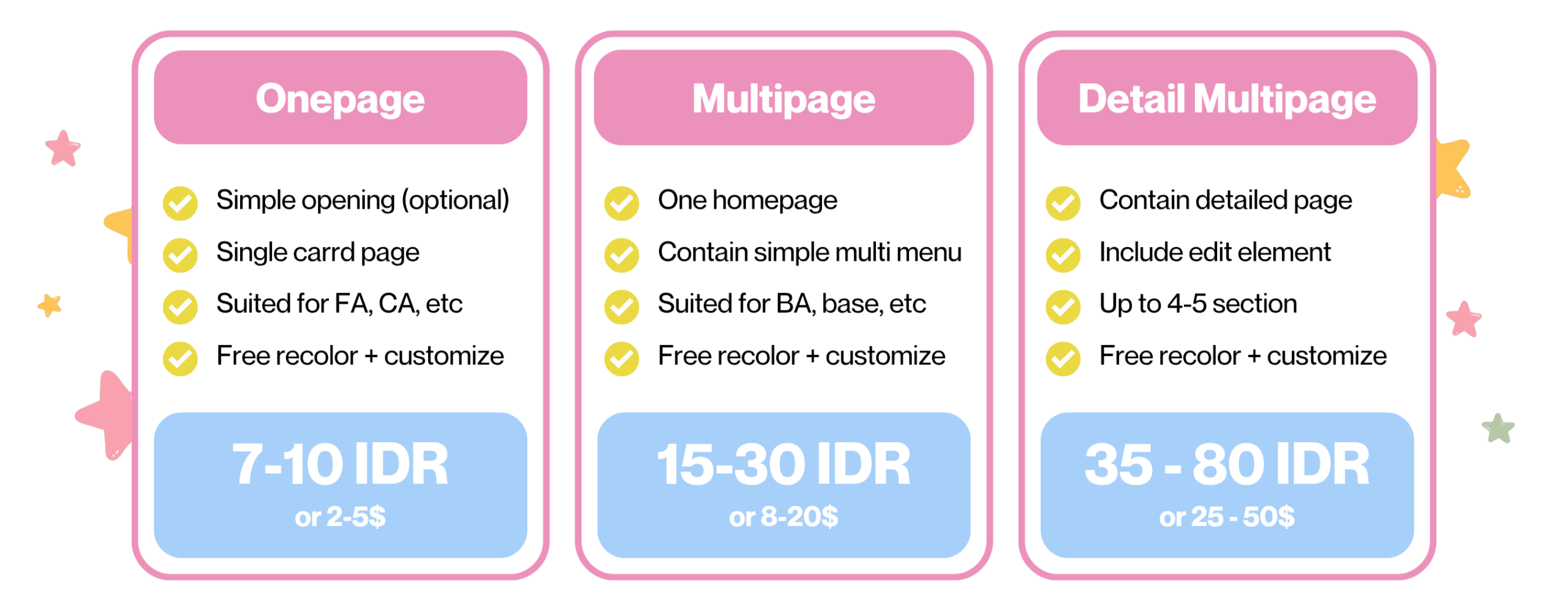 It’s recommended that you provide the materials for the Carrd (e.g., photos and wording). If I provide the materials, an additional IDR 5,000 fee applies.